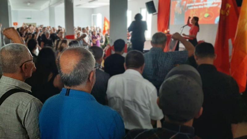 Komünist gençler, bayraklar ve sloganlarla salona girdi. Salondan, “Leyla yoldaş yaşıyor, MLKP savaşıyor”, “Leyla yoldaş ölümsüzdür”, “Jin, jiyan, azadî”, “Partinin yıldızı Komünist Gençlik Örgütü”, “Yaşasın kadın dayanışması” sloganları yükseldi.