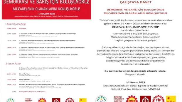 Halkların Eşitlik ve Demokrasi Partisi (DEM Parti), Emekçi Hareket Partisi (EHP), Toplumsal Özgürlük Partisi (TÖP), Emek Partisi (EMEP), Türkiye İşçi Partisi (TİP) ve Sosyalist Meclisler Federasyonu (SMF) “Demokrasi ve barış için buluşuyoruz, mücadelenin olanaklarını konuşuyoruz” şiarı ile 2 gün sürecek bir çalıştay düzenleyecek. Türkiye’de yaşanan demokrasi krizleri, yönetim deneyimleri ve mücadele yöntemlerinin konuşulacağı çalıştay, 1 ve 2 Kasım tarihlerinde düzenlenecek. Birçok konuşmacının olduğu çalıştay, Ankara Makina Mühendisleri Odası (MMO) Eşitim ve Kültür Merkezi’nde düzenlenecek.