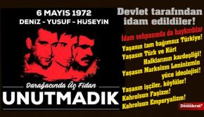 Oligarşik devlet tarafından idam edilen Deniz Gezmiş, Yusuf Aslan, Hüseyin İnan Mücadelemizde Yaşıyorlar! 6 Mayıs 1972’de Devlet tarafından idam edildiler!