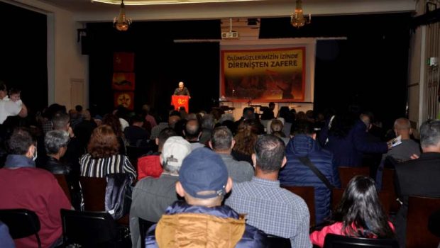 Zürih Volkhaus’da düzenlenen etkinliğe pandemiye rağmen çok sayıda kişi katıldı. Etkinlik salonu pankart ve şehitlerin fotoğraflarıyla donatıldı. Açılış konuşması sırasından Komünist Gençlik Örgütü (KGÖ) üyeleri sloganlarla salonda yürüyüş düzenledi.