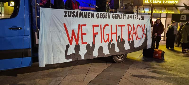 Stuttgart Rotebühl Platz meydanında, saat 17.00’de başlayan eylem ise Stuttgart’taki çok sayıda kadın kurumları, kadın sığınma evleri ve sendika temsilcilerinin ortak organize ettiği eylem oldu. Eylemin miting alanında çok sayıda polis arabasının konumlanması ise, kadınlara daha çok devlet şiddetini anımsattı.