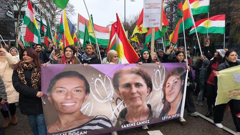 Stuttgart Tren Garı karşısında toplananan kitle Marienplatzt’a yürüdü. Yürüyüş kortejinin en önünde “Kürt, Alevi, Dürzi, Hristiyan halklara ve inaçlara dönük katliamlar durdurulsun!” pankartı açıldı. Kitlesel yürüyüşün yapıldığı eylemde, “Biji Berkwedana Eşreffiye/ Şeyhmâksut/ Rojava, Yaşasın enternasyonal dayanışma, Terörist HTŞ, Terörist Erdoğan, Jin Jiyan Azadi, Katil HTŞ işbirlikçi AKP, Kürdistan Faşizme Mezar Olacak” sloganları atılırken Rojhilat Serhıldanı ve Iran halklarının direnişi selamlandı.