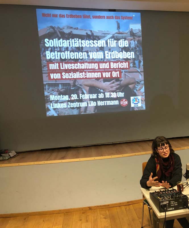 Almanya’nın Stuttgart şehrinde “Deprem değil rant öldürür, dayanışma yaşatır” kampanyası kapsamında Lilo Hermann konferans salonunda düzenlenen akşam yemeğinde bir araya gelindi. Etkinliğe HDP İzmir Milletvekili Murat Çepni, ESP / SKM sözcüsü Çiçek Otlu Skype ile katıldı. Sosyalist gençlik örgütü Young Struggle temsilcisi de etkinlikte bir sunum yaptı.