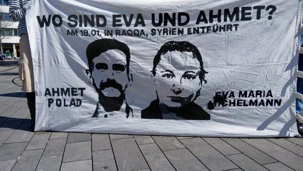 Almanya’nın Stuttgart kentinde Bad Cannstad tren istasyonu çıkışında Eva ve Ahmet’e Özgürlük İnisiyatifi, Suriye’nin Halep kentindeki bir hapishanede tutsak bulunan Eva Maria Michelmann ve Ahmet Polad’ın (Mehmet Nizam Aslan) derhal serbest bırakılmasını istedi.