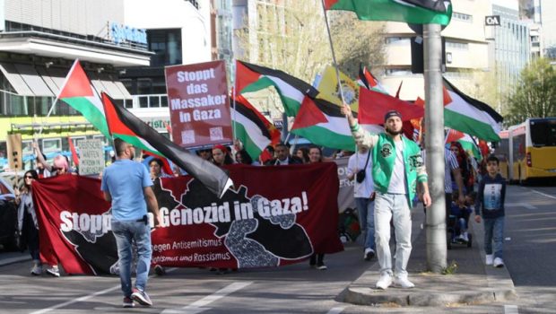 Eylemde sık sık Almanca ve Arapça “Filistin Halkı yalnız değildir”, “Katil İsrail işbirlikçi ABD ve AB Emperyalizmi”, “Almanya Finansçı İsrail Bombacı”, “Yaşasın Enternasyonal Dayanışma sloganları atıldı.