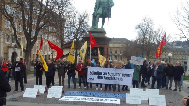 ADGB tarafından merkezi olarak yapılan açıklamanın Türkçe ve Almanca metninin sürekli okunduğu eylemde, Türkçe ve Almanca enternasyonal dayanışma sloganları atıldı.