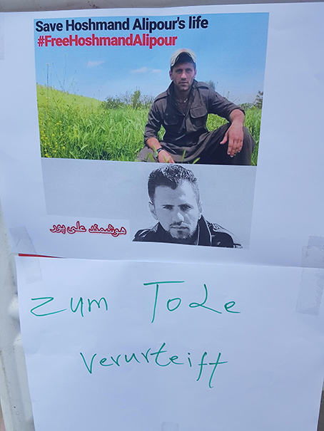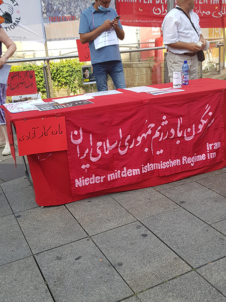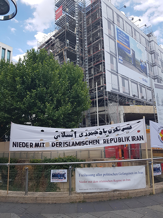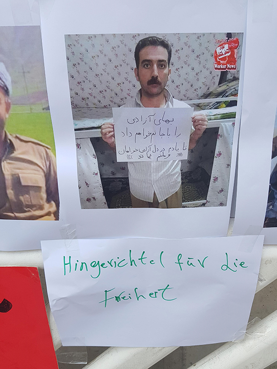 İran’da 5 haftadan beri Grevde olan işyerlerinden biri olan Industriekomplex Haft Tappeh şeker fabrikası işçilerinin yürüttüğü greve dair bilgilendirme konuşmaları yapıldı. İran’daki bu işçi grevine enternasyonal düzeyde 80 civarında Sendikanın da dayanışmalarını açıkladıkları belirtildi. Şeker fabrikası işçilerinin 5 haftadan beri sürdürdükleri haklarını isteme grevinin başarıya ulaşabilmesi için maddi ve manevi desteğe ihtiyaçları olduğu dile getirildi. Bu konuda hazırlanan el ilanları kent sakinlerine dağıtıldı. Hameniy’nin bu sistemin başı çekeni olarak tarihi bir çöküntüyü hazırladığı, bu yüzden 1.500 muhalif kişiyi katlettirdiği, 8.000 kişiyi de cezaevlerine attırdığı sert bir şekilde dile getirildi. Ardından ‘’İran rejimi, katil, terör, insanları asan ve ölüm demektir!’’, ‘’Kahrolsun İran İslamist rejimi!’’, ‘’Bütün politik tutsaklara özgürlük!’’, ‘’İran işçileriyle dayanışmaya!’’, ‘’İdamları durdurun!’’, ‘’Yaşasın adalet ve özgürlük!’’, ‘’Yaşasın enternasyonal dayanışma!’’ sloganları defalarca tekrarlandı. Açılan büyük pankartlarda Almanca ve Frasça’’Kahrolsun İslamist İran Rejimi!’’ yazılırken, İran’da şimdiye kadar idam edilen ve idam edilme kararı verilenlen bir çok kişinin posterleri de açıldı.