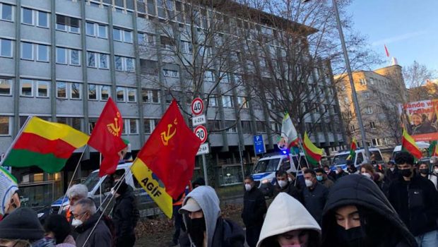 Eylemde, PKK, YPG, YPJ, MLKP, MLPD, AGİF, Alınteri gibi parti ve örgütlerin bayraklarıyla, Kürt Halk Önderi Abdullah Öcalan’ın posterleri taşındı.