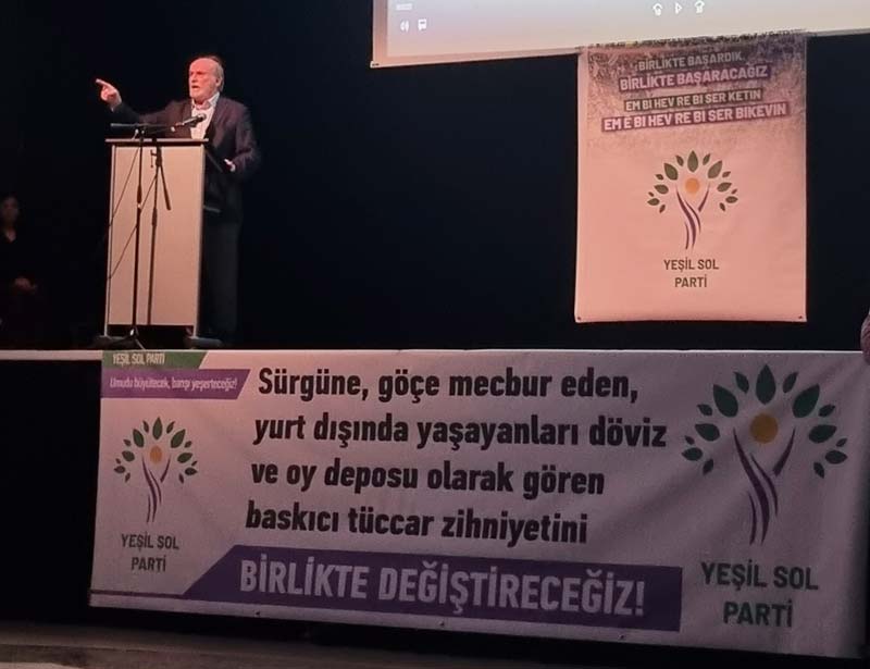 HDP onursal başkanı Ertuğrul Kürkçü yaptığı konuşmasıyla 14 Mayıs seçimlerine oldukça büyük anlam yükleyerek,’’partimizin bu seçimdeki tutumu bellidir. Bu seçimle Tayyip Erdoğan karşısındaki adaya oy veriyoruz. Bu aday daha iyi olduğu için değil, biz kendimiz daha iyi olduğumuz için bu adaya oy veriyoruz. Bu kayyum, bu zulüm altında, bu mezhep dayatma tarzı altında, kadınlara yapılan zulüm, katliamlar altında daha fazla yaşayamayız. Kendi yolumuzu açmamız gerekiyor. Bu zihnet altında, bu şekil yaşam dayatması altında, İnkar edilen kimlik ve dilimizle daha fazla yaşayamayız. Seçimlerden kısa bir süre önce HDP’yi kapatıp, bizleri alternatifsiz bırakmak isteyenlere karşı Yeşil Sol Parti ile seçimlere giriyoruz. Onun için yurtiçinde olduğu gibi yurtdışındaki seçmenlerin de bu seçimlerde rölü büyük olacak. Bir oyun bile bize bir milletvekili kazandıracağını düşünerek, seçimlere önem vermeliyiz. Her kesimden seçmenlerin seçim sandıklarına gitmesi gerekir’’ vurgusunda bulundu.