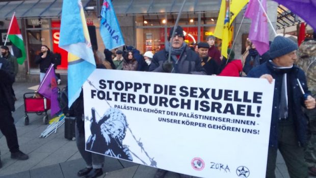 Eyleme Yeni Kadın, Alınteri ile Palastina Komite katılırken, KA ve SYKP de destek verdi. Eylemde “İsrail tarafından uygulanan Cinsel işkenceyi durdurun” pankartı açıldı. Enternasyonal Dayanışma ve Filistin halkının direnişini selamlayan sloganların ardından ZORA ve Almanya SKB’nin açıklamaları okundu.