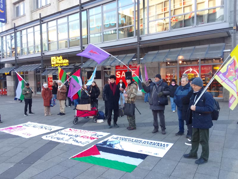Eyleme Weinachten – Noel’den kaynaklı caddenin kalabalık olmasından dolayı başta Ortadoğulu göçmenler olmak üzere birçok insan eyleme ilgi gösterdi. Telefonlarıyla video çekimleri yaptı. Eylemde İsrail Siyonizmi’nin işkenceci katliamcı tecavüzcü yüzü bir kez daha teşhir edildi.