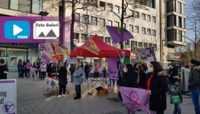 ADKH, Mor-Kızıl Kolektif, SKB, TJK-E, Yeni Kadın, İnterBündnis, MLPD gibi kurumların bayraklarıyla katıldığı bugünkü eylemde Clara Zetkin, Rosa Luxemburg gibi