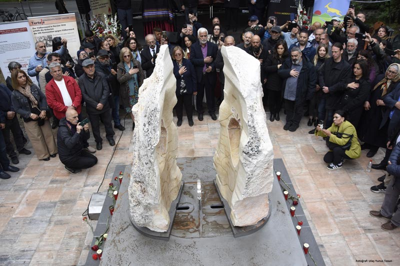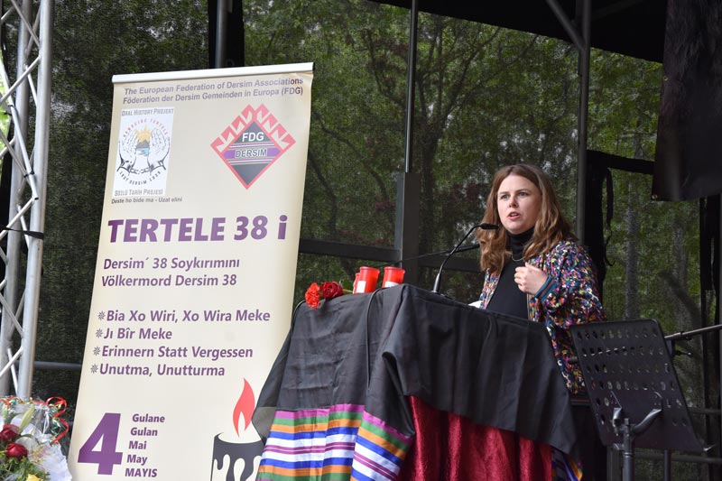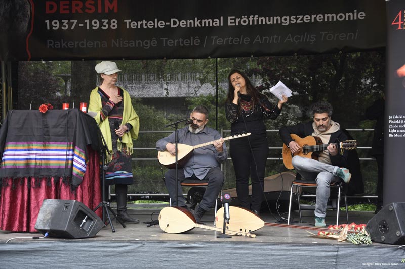 Avrupa Dersim Dernekleri Federasyonu (FDG), Dersim Kültür Derneği Berlin öncülüğünde başlatılan ve tasarımı Sanatçı Ezgi Kılıçaslan’a ait olan Soykırım Anıtı’nın açılışı Kültür Binasının bulunduğu Waterloo-Ufer adresinin yanındaki parkta gerçekleşti. Moderasyonu Aşnan Tiyatro Topluluğu’ndan Sanatçı İsmail Erol’un gerçekleştirdiği açılış programı soykırımdan günümüze katledilen Alevi canlar aşkına çerağ uyandırma ve Kırmançki-Kurmanci-Türkçe gülbenklerle başladı. Gülbenkler; Cevahir Altınok Ana, Narin Gülçiçeği Ana, Pir Seydali Çiçek, Pir Celal Keykutbat, Pir Turabi Karabulut (FDG) tarafından verilirken, çerağ ise; Dersim Kültür üyesi genç Piya Halat tarafından uyandırıldı. Ardından İnanç temsilcileri selamlama konuşması yaparak bu tarihi önemli çalışmada emeği geçen herkese teşekkür etti. Daha sonra sahneye Dersim’in önemli Ozanlarından Ozan Rençber ve Müzisyen Özgür Demiral çıkarak Kırmançki-Zazaki ağıt okudu. Ozan Rençber ve Demiral daha sonra konuşma aralıklarında sahne alarak ağıtlar seslendirmeye devam etti.