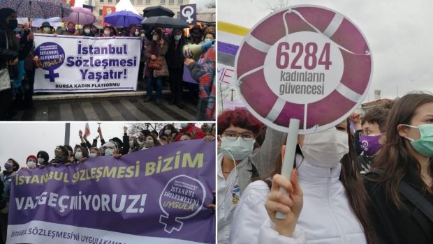 Bursa’da, Bursa Kadın Platformu’nun çağrısıyla Fomara Meydanı’nda bir araya gelen kadınlar İstanbul Sözleşmesinin iptal edilmesini protesto etti.