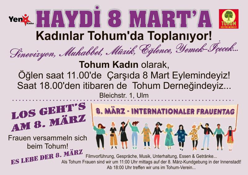 Ulm şehir merkezinde “Demokratik Kadın Platformu” tarafından gündüz gerçekleştirilen gösteri sonrası, “Tohum Kadın Grubu” tarafından ikinci bir etkinlik de dernekte gerçekleştirildi.