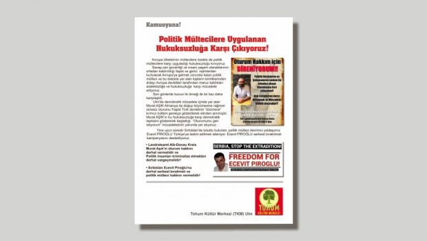 Tohum Kültür Merkezi (TKM) Ulm, yayımladığı açıklamayla, Almanya’nın Ulm kentinde Murat Aşık’ın ve Sırbistan’da Ecevit Piroğlu’na uygulanan haksız uygulamaları protesto ederek, her iki devrimci için de yürütülen çalışmalarda aktif yer alacaklarını duyurdu.