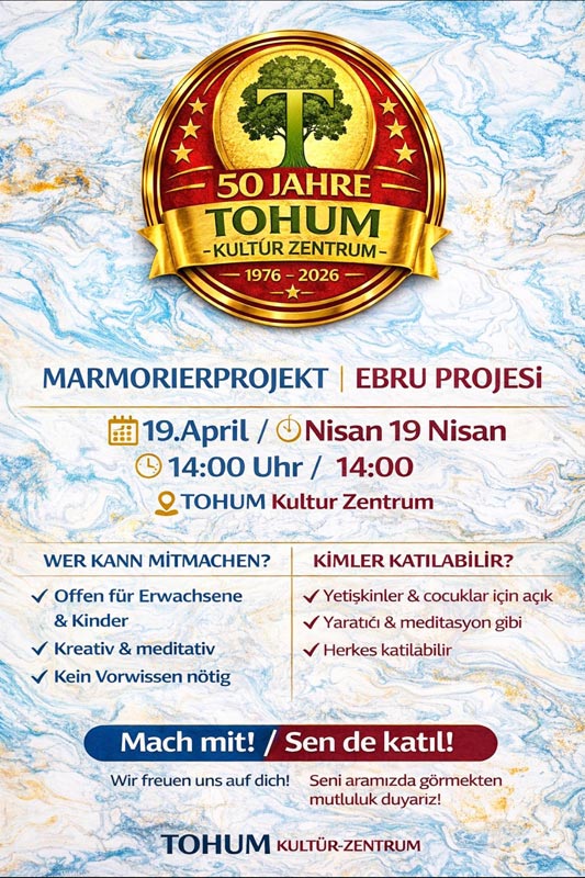 Ulm’da faaliyet yürüten Tohum Kültür Merkezi, ebru-mermer boyama çalışmalarına başladı. Hilal Nikbay tarafından yürütülen etkinlik, her pazar günü saat 14.00’ten itibaren katılımcılara açık olacak.