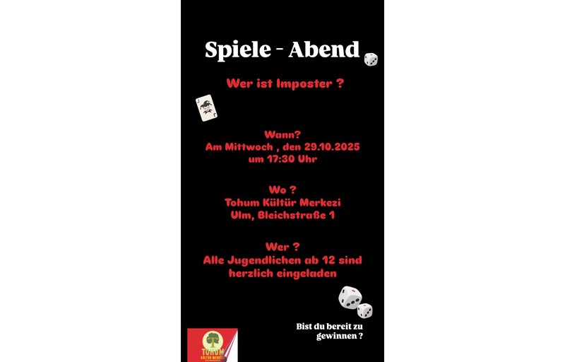 Tohum Kültür Merkezi’nde düzenlenen “Spiele-Abend” (Oyun Akşamı) etkinliği, okul tatiline denk getirilerek 12 yaş ve üzeri gençlerin rahatça katılabileceği bir tarihte organize edildi. Ulm Bleichstraße 1 adresindeki merkeze gelen gençler, eğlence ve strateji dolu saatler geçirdi. Tohum’da örgütlü çok sayıda Yeni Demokratik Gençlik (YDG) de etkinliğe aktif katkı sundu.