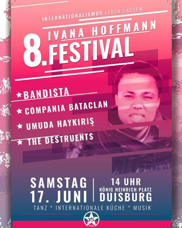 Sevgi ve umut dolu enternasyonalist devrimci Ivana Hoffmann’ın adına bu yıl 17 Haziran Cumartesi günü Duisburg’da yapılacak olan 8. Ivana Hoffmann Festivaline tüm halklarımızı, işçi ve emekçileri, gençleri, kadınları, LGBTI+’ları katılmaya çağırıyoruz.