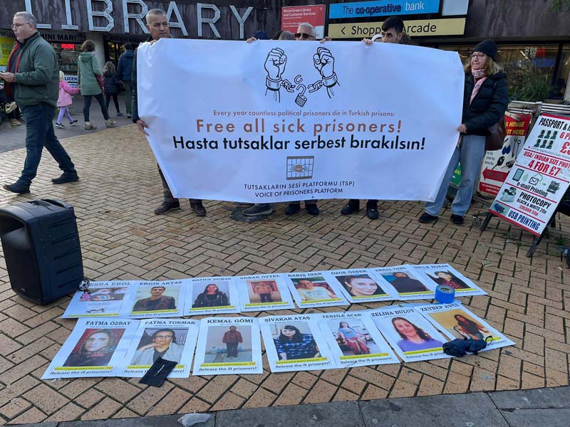 İngiltere’nin başkenti Londra’da „hasta tutsaklar serbest bırakılsın” eylemi yapıldı. Londra’da göçmenlerin yoğun yaşadığı Woodgreen Kütüphanesi önünde yapılan eylemde TSP tarafından İngilizce ve Türkçe olarak “Türkiye hapishanelerinde her yıl çok sayıda hasta tutsak ölüyor! Hasta tutsaklar serbest bırakılsın!“ pankartı açıldı ve hasta tutsakların resimleri taşındı.