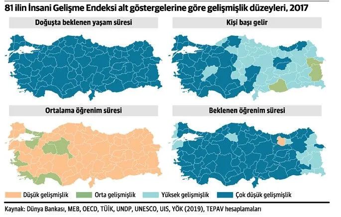 Türkiye Ekonomi Politikaları Araştırma Vakfı (TEPAV), Birleşmiş Milletler Kalkınma Programı’nın (UNDP) 2020 yılı İnsani Gelişme Raporunu temel alarak Türkiye’nin 81 ili için “İnsani Gelişmişlik Endeksi” çıkardı.