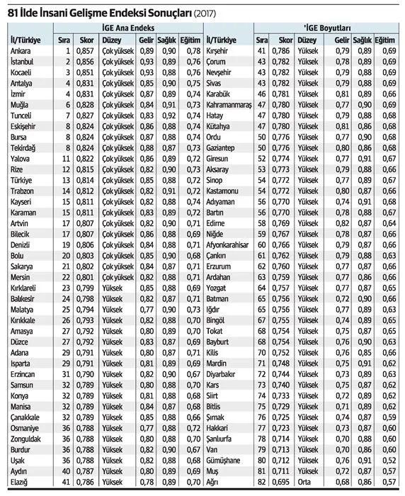 TEPAV’ın 2017 yılına ilişkin 81 ile yönelik yürüttüğü İnsani Gelişmişlik Endeksi çalışmasında illerin, gelir, sağlık ve eğitim düzeyine sınıflandırma yapıldı. Bu kapsamda küresel sınıflamaya göre gelişmişlik düzeyi ‘çok yüksek’ grubunda 21 il yer alıyor.