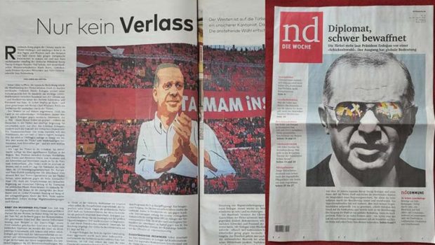 Sol eğilimli “ND Die Woche”, kapak sayfasının tamamen Erdoğan’a ayırdı. Erdoğan’ın güneş gözlüklerine İsveç bayrağını yakan AKP taraftarlarının ve Almanya’da bir protesto gösterisindeki PKK taraftarlarının görüntülerinin monte edildiği tam sayfayı kaplayan portre fotoğrafıyla yer aldığı gazetenin manşeti şöyle: “Ağır silahlar kuşanmış diplomat” (Diplomat, schwer bewaffnet)