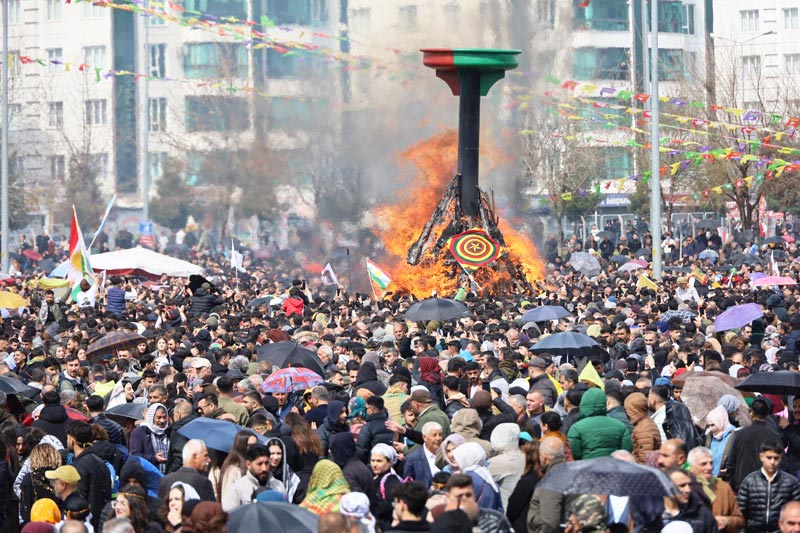 Havanın yağmurlu olması ister istemez akıllara “acaba” sorusunu düşürdü. Ancak yaşlısından gencine Kürt halkı, yağmur-çamur demeden sel gibi akarak boydan boya alanı doldurdu. Geleneksel zafer işareti yapanlar, alanda mangalar halinde yürüyüş yapanlar, yağan yağmura aldırış etmeden kadınlı-erkekli kol kola halay çekip zılgıt atanlar… Sahneden devam eden konuşmalar alkışlarla karşılanıyordu. Alanın orta yerine kurulan Newroz ateşi ve çevresi, fotoğraf çekenlerin, ellerinde ne varsa ateşe attıkları ve adeta dilek tutulan bir kutsallık derecesinde en çok ilgi gören yerdi.