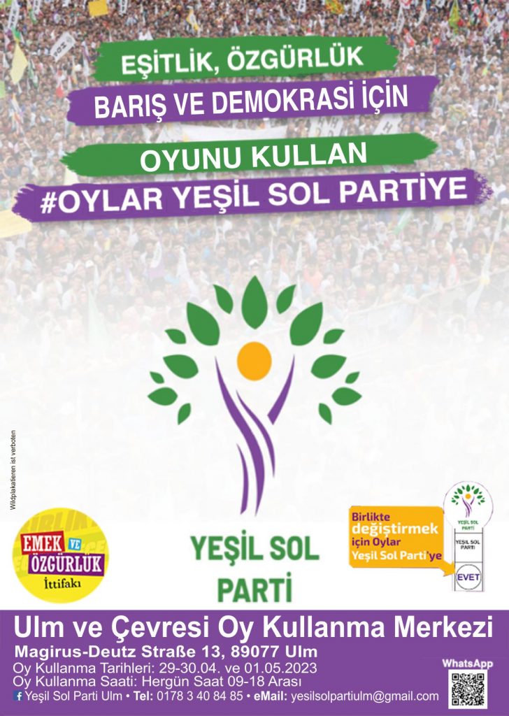 Seçim irtibat bürolarından, halk toplantılarına birçok konuda kararlar alan Yeşiller Sol Parti, Ulm ve çevresinde yaşayan Türkiyeli seçmenleri oy kullanmaya, seferber olmaya çağırdı. Ulm’da da ilk kez sandık kurulacak olması nedeniyle de, bu bölgenin öneminin arttığı özellikle belirtildi ve ona göre bir faaliyet yürütülmesi gerektiğinin altı çizildi.