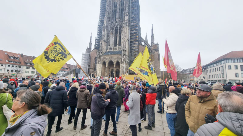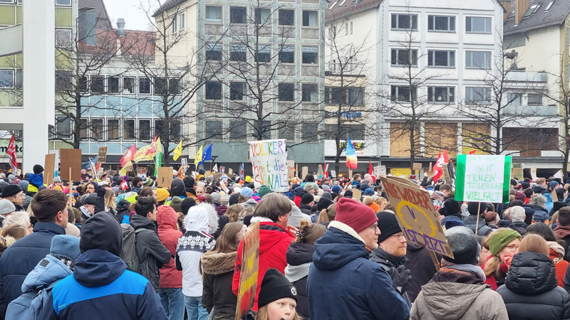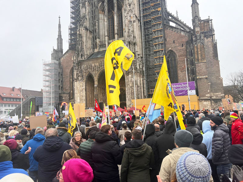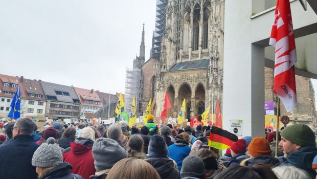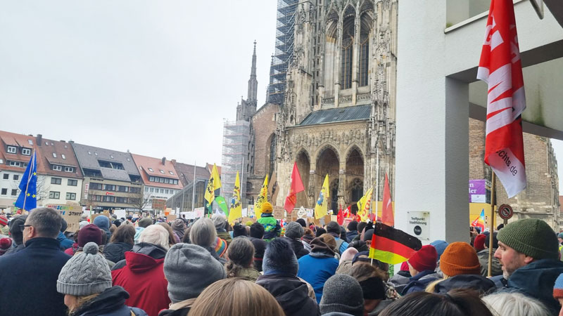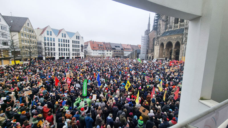 CDU/CSU’nun başbakan adayı Friedrich Merz’in sunduğu ve AfD’nin desteğiyle kabul edilen sınır dışı ve göç politikalarını sertleştiren yasa tasarısı protesto edildi. Antifaşist grupların çağrısıyla Ulm’da gerçekleştirilen mitinge 15 bine yakın kişi katıldı. Meydan tıka-basa doldu: 15 kişi kişi faşizme karşı durdu
