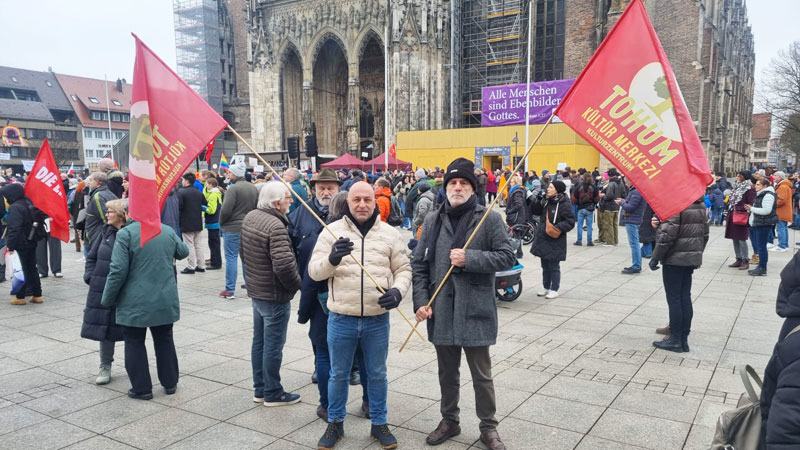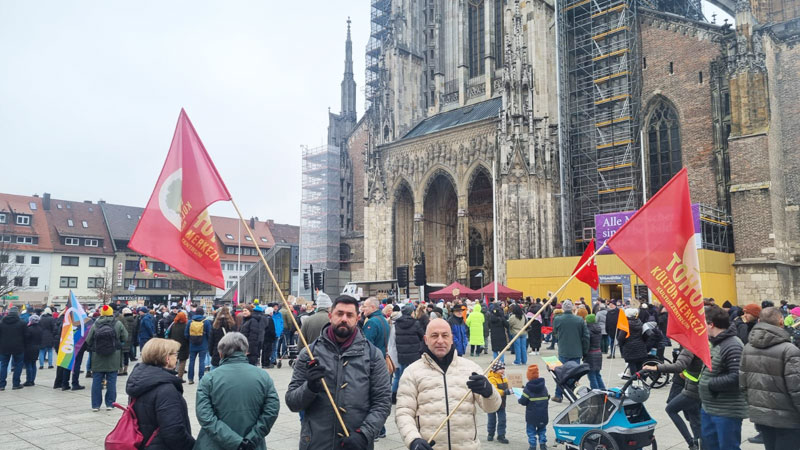 Irkçılığa ve AfD’ye karşı net bir duruş: Yaklaşık 13 binden fazla kişi, bugün Ulm’da gösteri düzenledi. Binlerin katıldığı eylemde, ADHF, ATİF, AGİF, DİDF, Sol Parti (TR) gibi göçmen kurumları da katıldı. Tohum Kültür Merkezi de bayraklarıyla miting alanında yerini aldı.