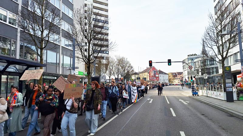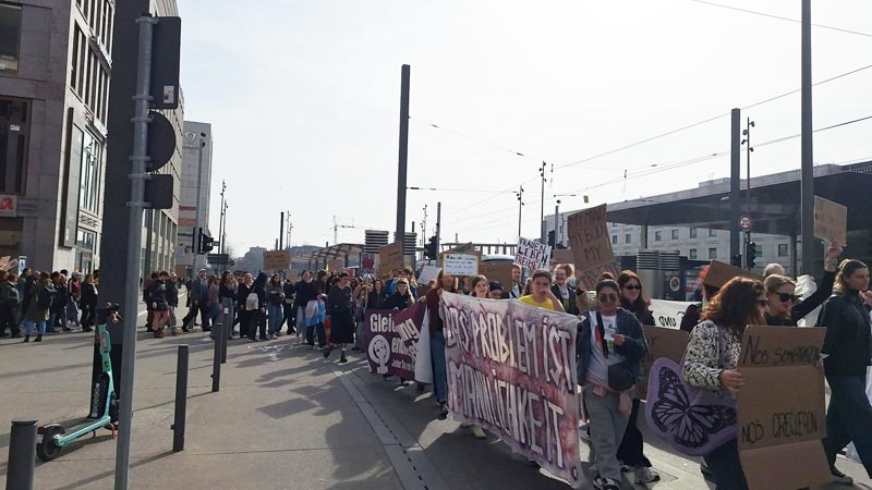 Öğleden sonra ise FLINTA Kolektifi’nin çağrısıyla Albert-Einstein-Platz’ta 8 Mart mitingi düzenlendi. “Feminizm antifaşizm demektir” şiarıyla gerçekleştirilen miting ve yürüyüşe yaklaşık 700 kişi katıldı.