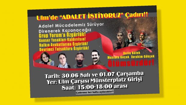 Ulm Halk Cephesi tarafından dün saat 15:00-18:00 arası “Adalet İstiyoruz” şiarıyla açılan enformasyon çadırı bugün de aynı saatte ve yerde yine açılacak.