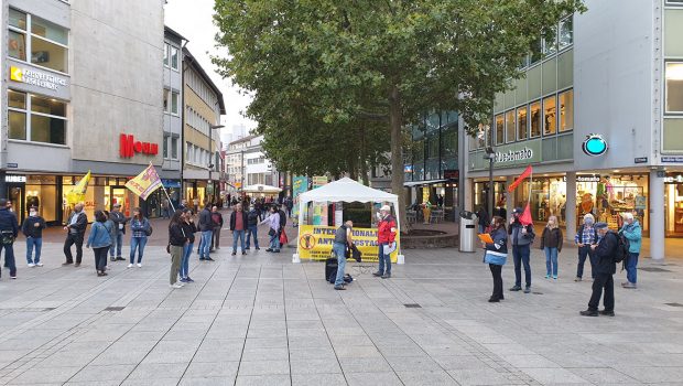 Enternasyonal Birlik (InterBündnis), MLPD, AGİF, ADHF, Halk Cephesi tarafından çağrısı yapılan gösteriye SKB, Trotz Alledem, Sol Parti (Türkiye), KON-MED gibi kurumlardan üyeler ve HDP aktivistleri katıldı. Eylemde MLPD ve ATİF adına konuşmalar yapıldı. Yapılan konuşmalarda savaşın baş sorumlusunun emperyalizmin kar hırsı olduğu belirtildi.