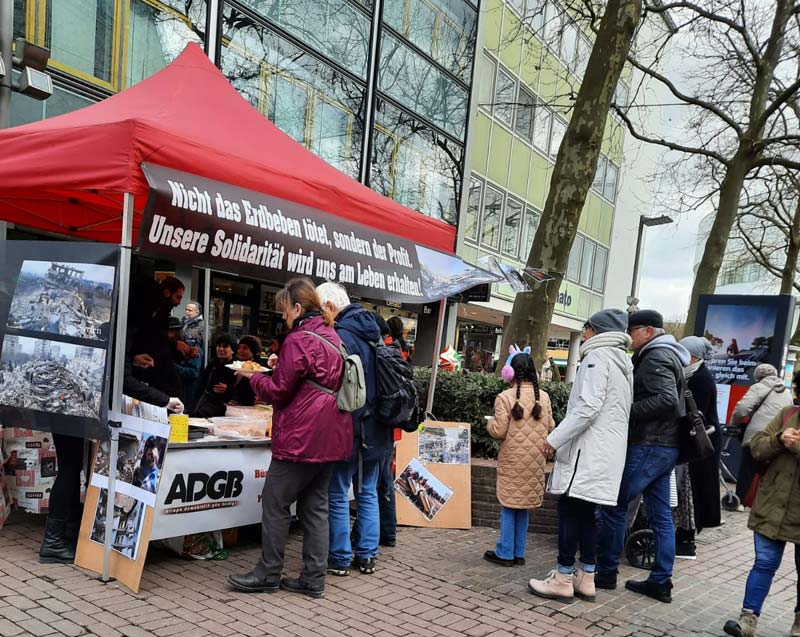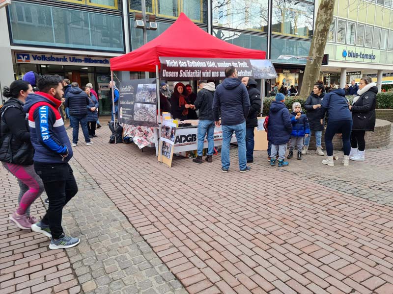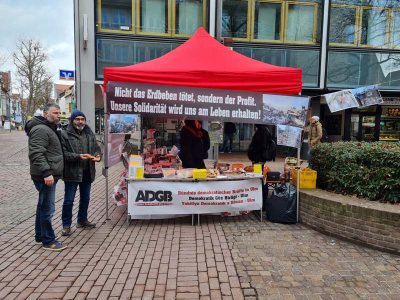 Avrupa Demokratik Güç Birliği (ADGB) Ulm Bileşenleri ADHF, AGİF, ATİF, FED-GEL ve HDP’li aktivistler şehir merkezinde “Öldüren deprem değil, kârdır. Dayanışmamız bizi yaşatacak!” mottosuyla yapılan etkinlikte ADGB ve Heyva Sor’un pankartı açılırken, deprem alanından çok sayıda fotoğraf da sergilendi.
