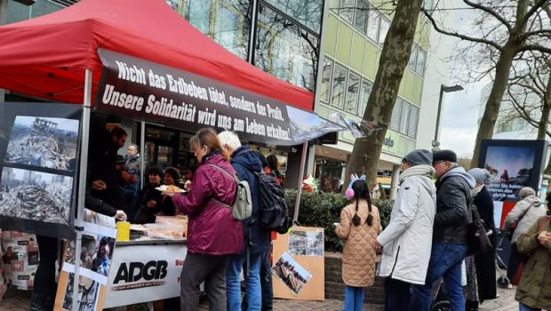 Avrupa Demokratik Güç Birliği (ADGB) Ulm Bileşenleri ADHF, AGİF, ATİF, FED-GEL ve HDP’li aktivistler şehir merkezinde “Öldüren deprem değil, kârdır. Dayanışmamız bizi yaşatacak!” mottosuyla yapılan etkinlikte ADGB ve Heyva Sor’un pankartı açılırken, deprem alanından çok sayıda fotoğraf da sergilendi.