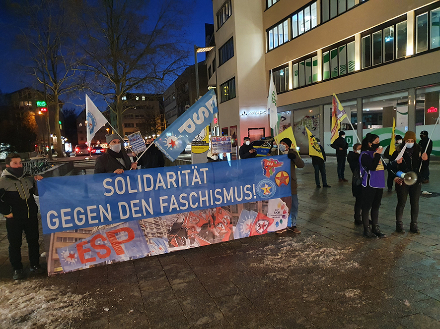 Türkiye ve Kürdistan’ın 12 ayrı şehrinde Ezilenlerin Sosyalist Partisi (ESP) genel başkanı Özlem Gümüştaş SGDF, SKM üyeleri, Limter-İş sendikası emekçileri, ETHA ve BEKSAV çalışanları , Kaldıraç dergisi okurlarının olduğu 51 kişi saray faşist iktidarı tarafından evleri, büroları, işyerleri basılarak gözaltına alınması karşı Ulm’de AvEG-Kon’un çağrısıyla gözaltına alınan Sosyalistlerle dayanışma amacıyla mitingi düzenlendi.