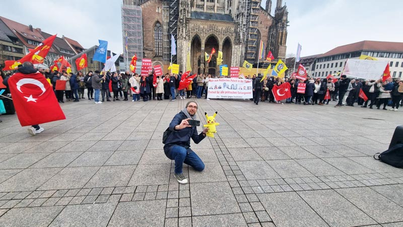 Antalya’da, İstanbul Büyükşehir Belediye (İBB) Başkanı Ekrem İmamoğlu’nun tutuklanması protesto edilirken, grup içerisinde, Pokemon çizgi filminin meşhur karakteri ‘Pikachu’ kostümlü kişi büyük dikkat çekmiş ve görüntüler sosyal medyada tıklanma rekoru kırmıştı. Ulm’daki mitinge de bir gösterici, Antalya’dakinin mini maketiyle de olsa gelmesi, ilgi odağı olmasını da beraberinde getirdi..