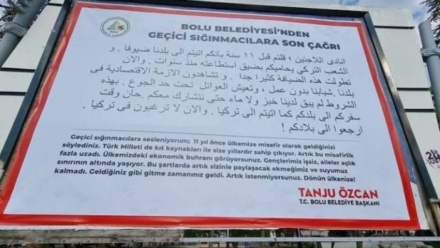 CHP’li Bolu Belediyesi, ırkçı faşist Belediye Başkanı Tanju Özcan’ın talimatıyla şehirde bulunan bilboardlara Türkçe ve Arapça ilanlar asılarak mültecileri hedef aldı. Özcan, daha önce de mülteci düşmanı açıklamaları ve mültecilere dönük belediye hizmetlerinin ekstra ücretlendirilmesi uygulamalarıyla fazlasıyla tepki toplamıştı.