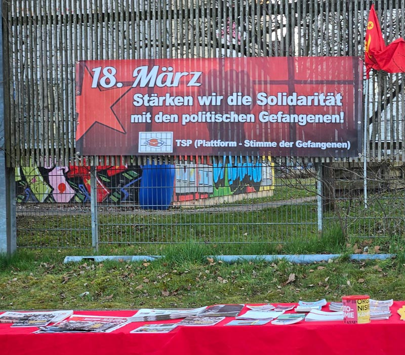Almanya’nın bir çok kentinde olduğu gibi‚ 18 mart Uluslararası Siyasi Tutsaklarla Dayanışma gününde,18 Mart’ta, ‘’Siyasi Tutsaklara Özgürlük’’ Eylemi Stuttgart’taki Stammheim Hapishanesi önünde yapıldı. Bu eylemde, siyasi tutsaklarla dayanışma mesajları, slogsanları, konuşmaları sesli mikrofonlarla duyuruldu.