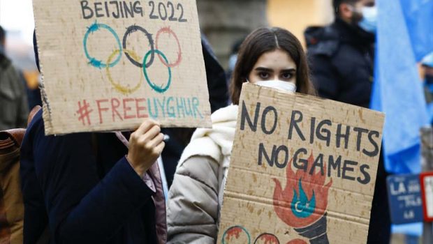 Göstericiler “Pekin 2022’ye hayır” ve “Çin işlediği suçlardan dolayı ödüllendirilmemeli” yazan pankartlar taşıdı.
