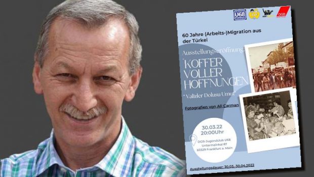 Gazeteci Ali Çarman’ın Türkiye ile Almanya arasında gerçekleşen iş göçü anlaşmasının 60. yılı sebebiyle hazırladığı çok sayıda resim ve belgelerden oluşan “Valizler Dolusu Umut” sergisi, 30 Mart 2022 tarihinde Alman Sendikalar Birliği Gençliği (DGB Jugend) Kulübü’nde (Untermainkai 67, 60329 Frankfurt) saat 20’de başlayacak. Serginin 30 Nisan 2022 tarihine kadar kalacağı kaydedildi.