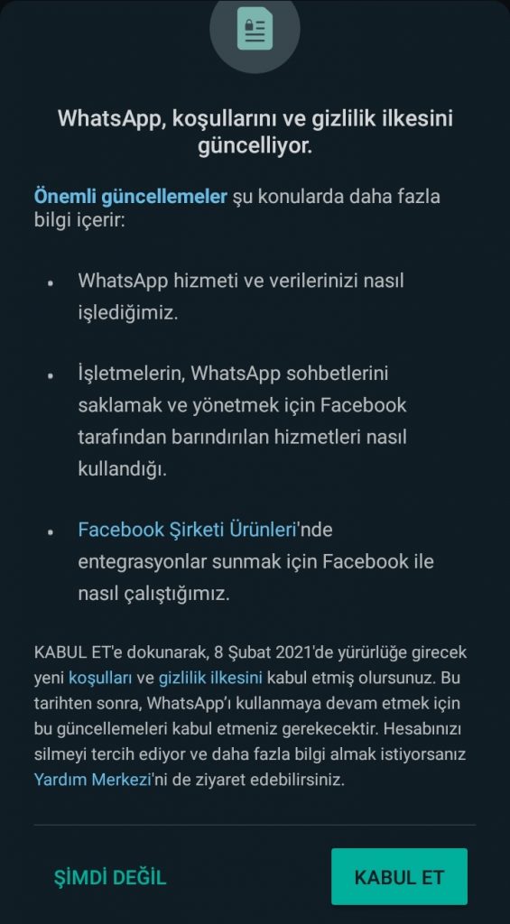 Burada tepki çeken nokta WhatsApp’ın yeni kurallarını ‘koşulsuz’ kabul ettirmek istemesi. Kullanıcılara bir seçenek bırakmayan WhatsApp, büyük bir tepkiye neden oldu.