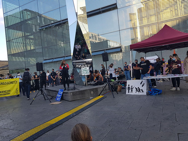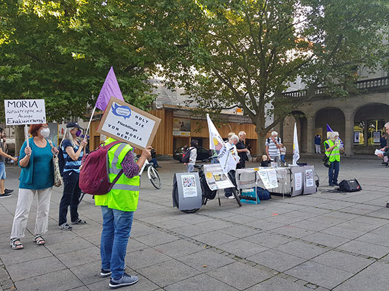 Kleine Schlossplatz Meydanındaki mitingde, meydan kısa sürede hızla doldu. Miting katılımcıları, “Yerimiz var!, Kampı kapatın!’’ diyerek, Midilli’de insanlık dışı koşullara yol açan, genel olarak Avrupa mülteci politikasına ve özellikle de Almanya’nın bu duruma karşı tutumu eleştirildi. Moria’daki mülteci kampının derhal boşaltılması talep edildi. Bir konuşmacı, “Şimdi birdenbire politikacılar, kendilerini kurtarıcı olarak tanımlıyorlar. Halbuki gerçeği görmemezlikten geliyorlar. 2.800 mülteci için tasarlanan kampta son olarak 13.000 kişi yaşıyordu. Gerçek ve adil mülteci politikasını yapmak için, ilk önce mültecilerin ülkelerindeki yeraltı ve yerüstü zenginliklerini sömürmemek ve hiçbir şekilde o ülkelere silahlar göndermemekle başlar’’denildi.