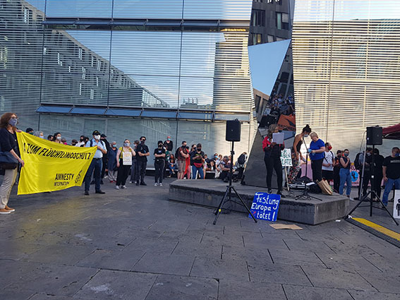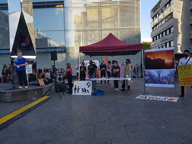 Moria kampındaki durumu anlatan aktivistler, kampta su temini ve hijyen koşullarının felaket düzeyde olduğunu vurgulayarak; ortaya çıkan ilk Corona durumuna verilen tepkileri sert bir şekilde eleştirdiler. Sanki bu durum yeterince vahim değilmiş gibi bir de kampta yeni bir çitin inşasına başlandığı vurgulandı. Bunun üzerine mitingde yer alan aktivistler hep birlikte “Yerimiz var,” diye haykırdı. “Politikacıların bu sorumluluktan kurtulmak için artık dolaylı konuşmayı bırakma zamanı” denildi. Just Human Derneği’nden Katja Walterscheid ise, Stuttgart Belediye Başkanı Fritz Kuhn’un tavrını eleştirerek,’’ Fritz Kuhn neyi hedefliyor? Eğer Federal meclis izin verirse, insanları kabul etmeye hazırız demek yeterli değildir. Bu yaklaşım bizlerde hayal kırıklığı yaratıyor. İnsanlar yanıyor; daha ne kadar beklemek istiyorsunuz?’’diye eleştirisel tepkisini dile getirdi.