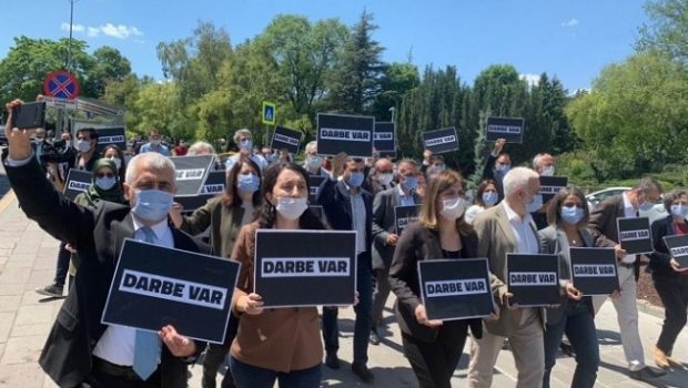 HDP’li vekiller Meclis’teki açıklamanın ardından “Darbe var” dövizleri ve “Darbeci AKP” sloganlarıyla Kızılay’da bulunan Güvenpark’a doğru yürüyüşe geçti.