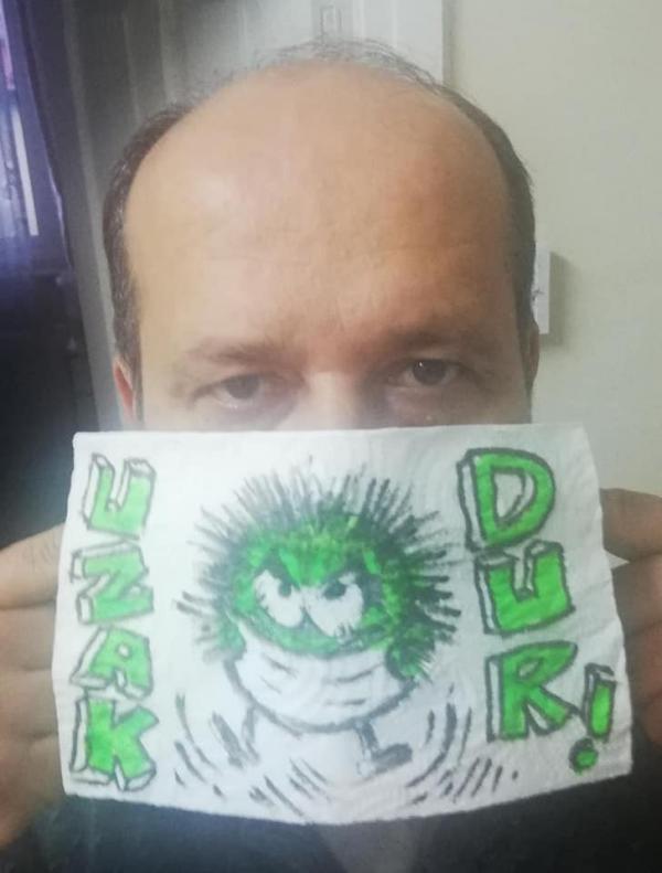 “Bizim bir WhatsApp grubumuz var. Orada bireysel çizimlerimizi paylaşıyoruz. Bu karantina günleri söz konusu olunca paylaşımları bir Instagram hesabı açarak orada daha geniş kitlelere ulaştıralım dedik ve “KarambaKarantina” sayfamızı açtık. Ben de karikatürü maskeye çizerek ve maskeyi takarak paylaşım yapayım dedim. Ardından gruptaki diğer çizer arkadaşlarıma fikrimi belirttim. Onlar da çizili maskeleriyle katkıda bulanarak sesimizi daha fazla kişiye ulaştırdık. Böylece maske takmanın önemine eğlence yoluyla dikkat çektik. Sosyal medyadan da takipçiler ve beğenenlerden gelen farklı görselleri de ekleyerek kampanyamız büyüdü.”