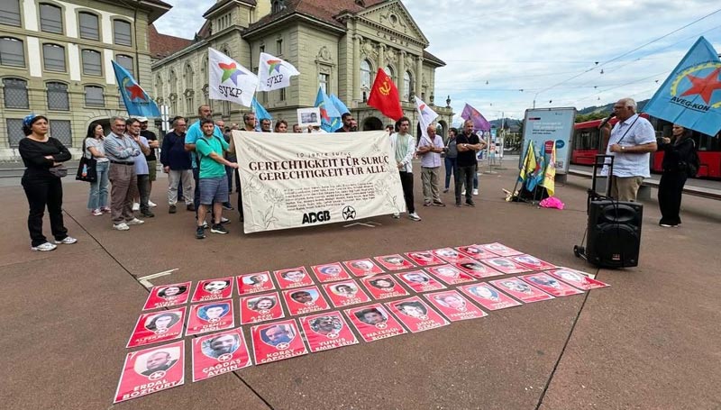 10 yıl önce faşist Türk Devleti’nin desteğiyle IŞİD’in Suruç’ta yaptığı bombalı katliamla 33 düş yolcusu ölümsüzleşmiş ve yüzden fazla genç yaralanmıştı. Bundan dolayı sosyalist gençliğin başlattığı “10. Yılında Suruç İçin Adalet Herkes İçin Adalet” kampanyası Bern’de sokakta eylemli olarak gerçekleştirildi.