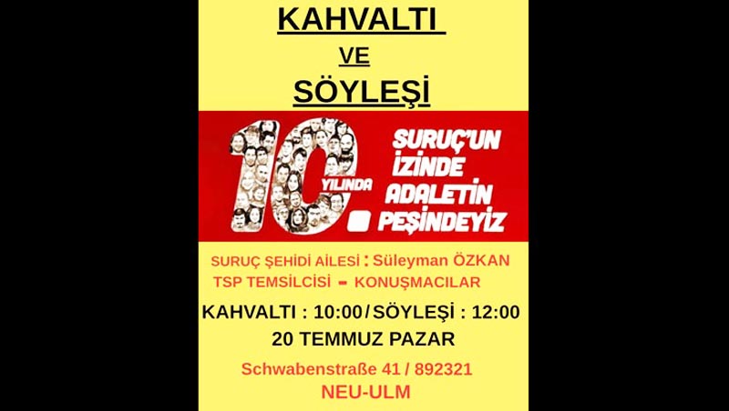 Suruç Katliamı’nın 10’uncu yılı dolayısıyla Almanya’nın Neu-Ulm kentinde “Kahvaltı ve Söyleşi” başlıklı bir anma etkinliği düzenlendi. Etkinlik, Schwabenstraße 41 adresindeki buluşma noktasında, Almanya Gömen İşçiler Federeasyonu (AGİF) bünyesinde faaliyet yürüten AJK derneğinde gerçekleşti.